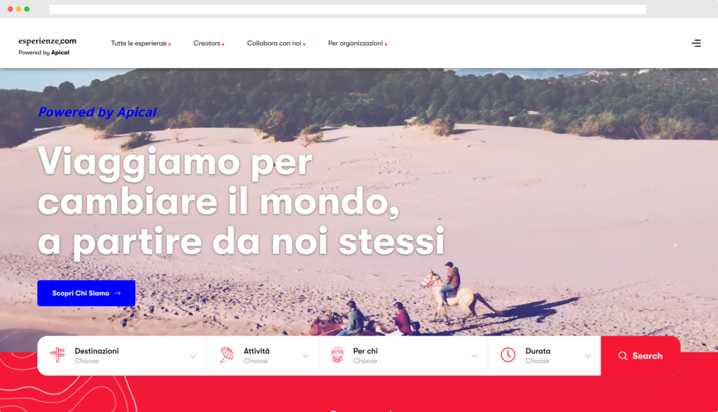 Ti portiamo subito sul mercato grazie a Apical Connects, il nostro network di agenzie, aziende e pubbliche amministrazioni innovative che in Apical acquisiscono esperienze straordinarie da offrire al proprio pubblico e ai territori